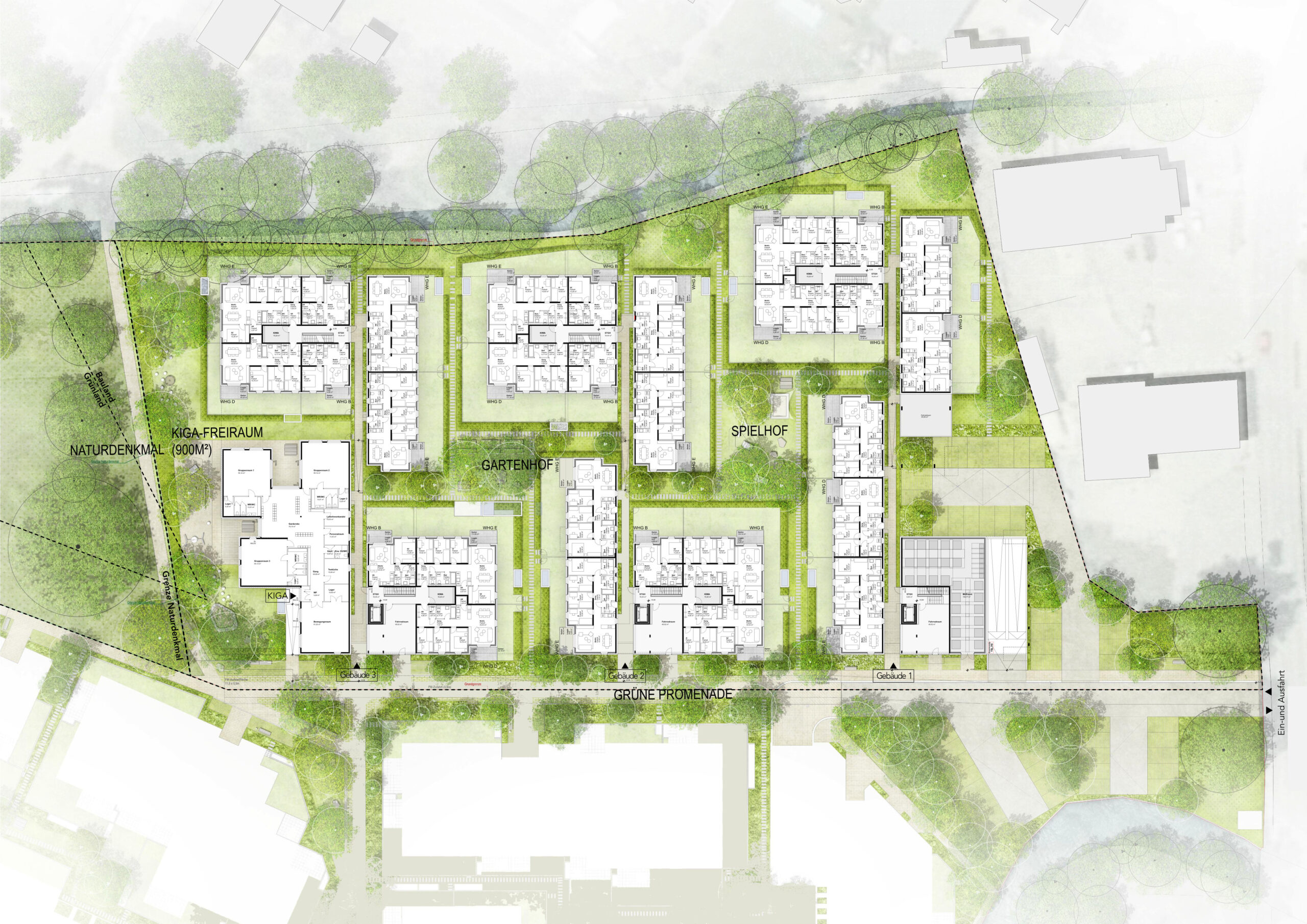 Den Architekturwettbewerb haben wir gewonnen, nun planen und errichten wir 117 Wohnungen mit insgesamt rund 9.000 m2 Wohnnutzfläche in bester Nachbarschaft . Hofähnliche Raumstrukturen, direkte Erschließung der Gebäude sowie fließende Übergänge zwischen öffentlichen, halböffentlichen und privaten Bereichen sorgen für heterogenes Wohnen im „eigenen“ Naherholungsraum.